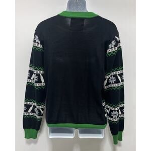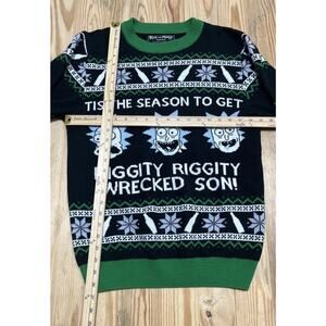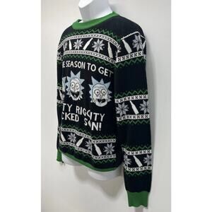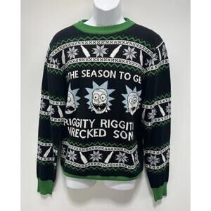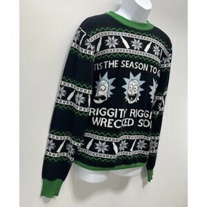 This Rick and Morty Men's XL Ugly Christmas Sweater is a black pullover featuring a graphic design of the popular animated characters. Made of acrylic knit fabric, the sweater has a crew neck, long sleeves, and a tight-knit texture. The humorous "Riggity Wrecked" theme makes it perfect for a Christmas party or cocktail occasion, adding a touch of fun and style to your winter wardrobe. Machine washable and in a size XL, this sweater is a must-have for any fan of Rick and Morty.