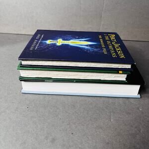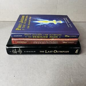 This is a hardcover lot with books titled "Percy Jackson and the Olympians", “The DEMIGOD DIARIES INCLUDING NEW SHORT STORIES, GAMES, AND MORE!” and “ THE DEMIGOD FILES” by Rick Riordan. The Last Olympian is book 5 the Percy Jackson and the Olympians Series. This fantasy novel, originally published by Disney Publishing Worldwide, features a first edition with a dust jacket. It falls under the genre of fantasy and is written in English.