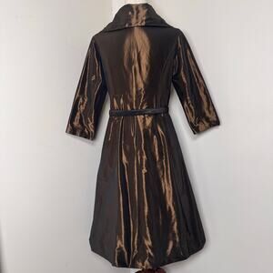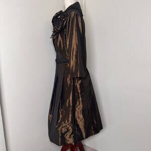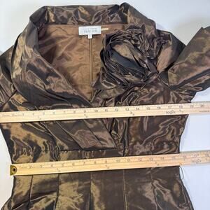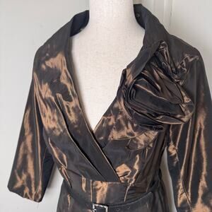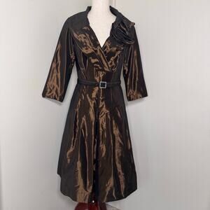 Stunning Metallic Brown Evening Dress with a hint of pewter. Wide Folded V-neckline adorned with floral emblem. 3/4 length sleeves. Fitted waistline. No belt needed or included. Aline cut bottom. Front pleated design. Fully lined. Small exposed thread & inconspicuous snag below waist. Ready for the party. Very good used condition, No Visible Flaws. Come with a belt