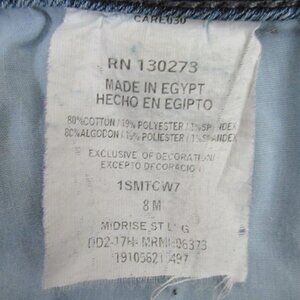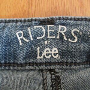 RIDERS BY LEE WOMEN'S SIZE 8 M JEANS MED BLUE SLUB STRETCH DENIM MID RISE STRAIGHT LEG. Fabric: 80% Cotton; 19% Polyester; 1 % Spandex. Slub jean fabric is textured with raised white lines vertically in a random pattern on the jeans. The white lines appear to be created by a thicker white thread woven into the fabric. Traditional 5 pocket jeans style. Might be a curvy fit style. Zip front fly with intact & working metal zipper. Pewter colored riveted metal shank button on waistband says "RIDERS by Lee". Pewter color rivets on front pockets say: "RIDERS by Lee". Designer back pocket stitching. 5 belt loops. Yoke in back. Gray and charcoal gray top stitching. The pictures show the exact item you are purchasing. ** Color may be slightly off due to monitor color setting/flash of camera **.