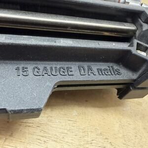 This listing is for a used, fully functional RIDGID 15-Gauge DA Angled Finish Nailer. The tool is visibly used and has cosmetic wear, including scuffs and dust, consistent with a pre-owned power tool. The magazine clearly indicates compatibility with "15 GAUGE DA nails". It features a comfortable over-mold grip and a quick-connect air coupler. The condition is as shown in the photos, which are of the actual item for sale. Selling tool only, no additional accessories or case are included.