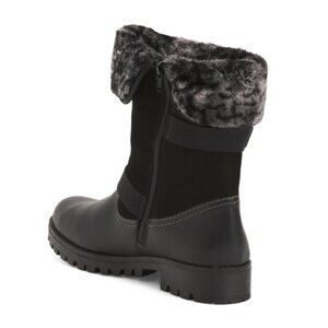 faux fur cuff, traction sole, buckle accent, pebbled finish, weatherproof, shock absorbing