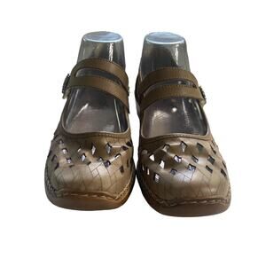 RIEKER Size 40 Mary Janes with Leather Cut Out Uppers. Comfort Shoes in Tan. Decorative metal medallion at hook and loop closure. Good pre-owned condition with normal signs of use and wear.