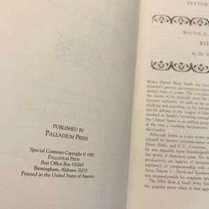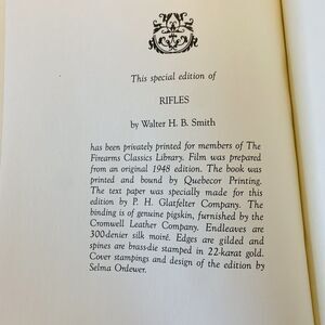 The product is a special leather-bound edition of "RIFLES" by Walter H.B. Smith, part of the NRA Firearms Classics series. The book features 22K gold brass-die stamped spines, gilded edges, and a pigskin binding, making it a visually impressive collector's item for firearms enthusiasts. Published in 1997 by Palladium Press, this illustrated edition offers a deeper look into the topic of rifles in North America, making it a valuable addition to any book or magazine collection focused on firearms.