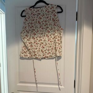 Sleeveless blouse with floral print. Button-up front. V-neckline. Lightweight and stylish.