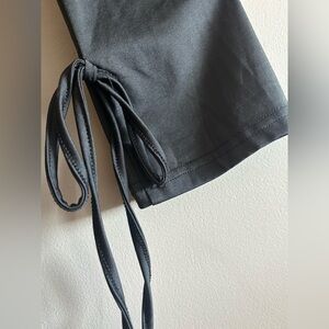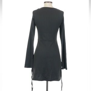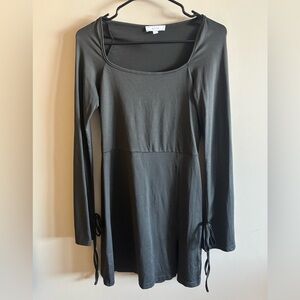 Chic black mini dress featuring side slit. Long sleeves with side ties on sleeves. Perfect for any occasion.