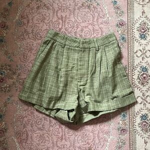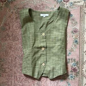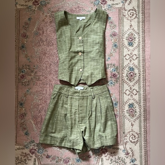 Stylish olive checkered vest with button closure. Matching tailored shorts for a coordinated look.