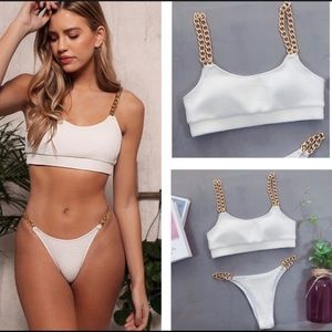 The Riley ribbed bikini is white and a quality ribbed material. It features gold chain straps on both the top and bottom. Top is a sporty cut style white the bottoms are cheeky and classically trendy.