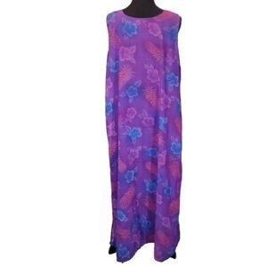 Lovely Rima Reversible Dress in hues of purple & blue. The purple side has tropical motif of hibiscus flowers and pineapples, the blue side has palm trees & flowers. Excellent condition