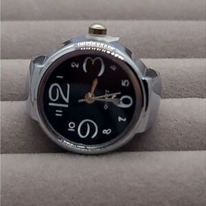 RING WATCH New Black Dial Stretchy Metal Band Silver Analog Quartz