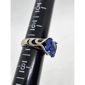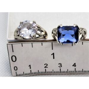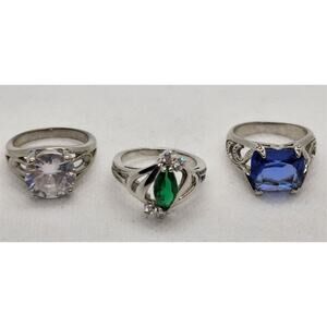 Lot of three size 7 rings. These rings are from Diamond Candle rings. Diamond Candle rings are imbedded in a candle that is purchased from Diamond Candle. When you burn the candle the ring is revealed. There is a number with the ring and you get the value from the Diamond Candle website. None of these are valuable-they are all glass costume jewelry. They are nice looking costume jewelry though and do not tarnish. They are all a silver tone (not silver), but I don't know the metal they are made from. There are one clear, one green, and one a blue/purple. They all have some type of detail work on the silver ring part. Please make sure you are choosing the right size.
