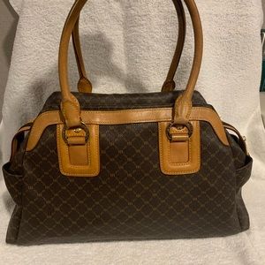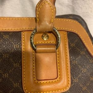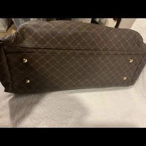 Brown monogram with beautiful leather trim. Has front pocket with magnetic closure. Magnetic pockets on each end. ( Great place to keep your key fob) Inside is like new, very clean (non-smoker owner) Also, inside there is a nice sized zipper pocket and an elastic cell phone pocket.