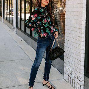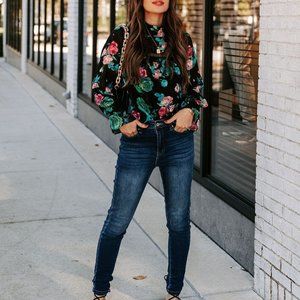 We’re loving moody winter florals! Our Rios Floral Lace Blouse in black features teal, blue, mint, fuchsia, purple, and yellow florals. Designed with a lace trim and a high neckline. Finished with ruffle cuffs.