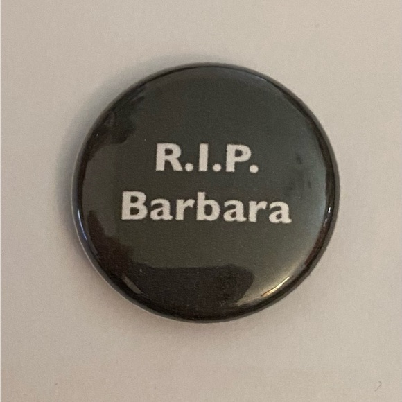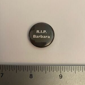 Black button with 'R.I.P. Barbara' text in white.
