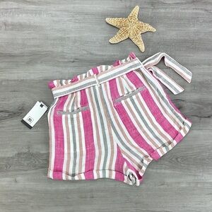 The Ashmore Stripe Short has a vintage allure, made from 100% viscose YD stripe fabric adorned with a ruffled paperbag waist, button font, and self-tie belt.