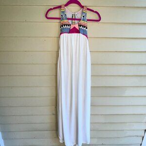 Adorable creamy vanilla dress with embellished yoke (beaded and embroidered) and rope lace-up detail at sides.