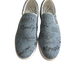 Step out in style with these RIP N DIP men's slip-on denim sneakers. Perfectly crafted for comfort and fashion-forward looks. New without box, these size 10 sneakers are ideal for casual outings and everyday wear. Writing on bottom of shoe only.