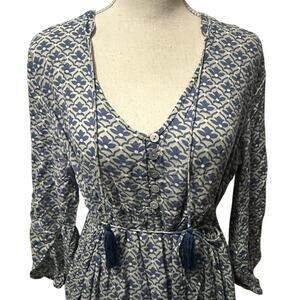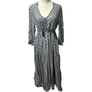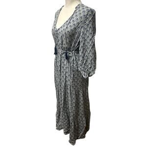 RIPE Mila Longline Tiered Maternity Dress Size Small Blue Geometric Print Boho