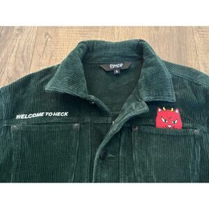 The RIPNDIP Corduroy Jacket in Green is a stylish unisex adults' jacket made from durable cotton corduroy fabric. It features a classic button closure and a regular by fit. The jacket's size is small and its sleek design makes it a versatile addition to any wardrobe. Perfect for casual outings or everyday wear, this jacket combines comfort and style effortlessly.