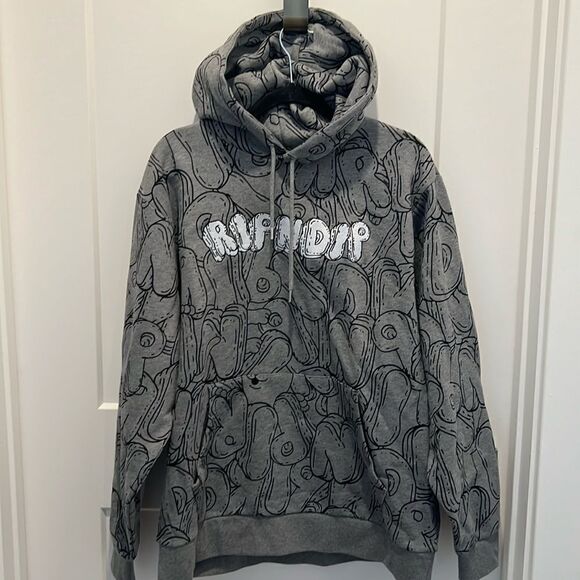 Take your sweatshirt game up a notch with the addition of the Bubble Bobble grey hoodie from RIPNDIP. This grey sweatshirt is made with a heavy construction with fleece lining for warmth. The RIPNDIP logo text throughout and embroidered at the chest offers a subtle contrast to this pull-over sweatshirt.