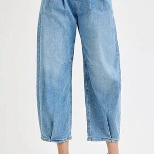 *These stylish high-waisted wide leg jeans feature a relaxed boyfriend fit with elegant front pleats that create a sophisticated vintage-inspired look. Crafted from premium cotton denim in a beautiful light blue wash, these cropped ankle-length jeans offer both comfort and style. The high-rise waistline provides a flattering silhouette while the wide leg design ensures all-day comfort. Perfect for casual weekends or dressed up with heels for a chic contemporary look. The classic five-pocket styling and quality construction make these jeans a versatile wardrobe essential.