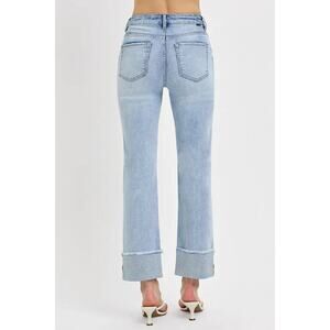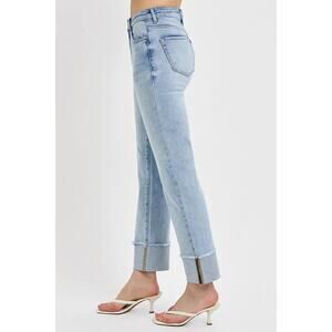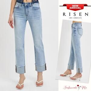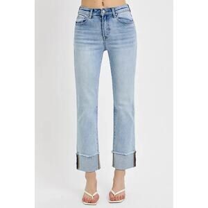RISEN High Rise Waist Cuffed Hem Zip Fly Light Wash Relaxed Straight Denim Jeans