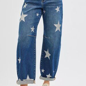 *The Mid Rise Ankle Length Relaxed Barrel Star Printed jeans are a stylish and fun addition to your denim collection. With a mid-rise waist, these jeans offer a flattering and comfortable fit. The relaxed barrel leg silhouette provides a laid-back and trendy look. Featuring star prints, they add a playful and unique touch to the design. Elevate your outfit with these fashionable mid rise ankle length relaxed barrel jeans featuring star prints for a chic and eye-catching ensemble.