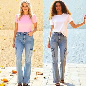 RISEN Retro Cargo High-Rise Slim Flare Tapered Acid Wash Denim Jeans Utility Pan