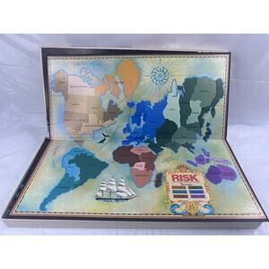The product is a vintage 1975-1980 Parker Brothers board game called "Risk," designed for 2 players and suitable for ages 12 and up. This strategy game involves players taking turns to conquer territories and achieve world domination. With a mix of luck and strategy, players must carefully plan their moves to outwit their opponent and achieve global supremacy. Designed for both boys and girls, this classic board game is a timeless favorite for family game nights and gatherings.