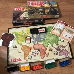 RISK The Game of Strategic Conquest by Hasbro Gaming 2015:: Includes 1 Gameboard, 1 Instructions Booklet, 5 Dice (3 red-Attack, 2 blue-defense), Game board cards (42 territory, 12 mission and 2 wild cards): 5 Armies which inclued 42 Infantry troops, 12 Cavalry troops, 8 Artillery troops in colors Blue, Orange, Black. Green and Yellow: Pre-owned like new