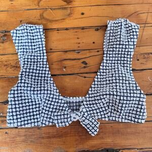 Details: Rite Row Vintage 1950's inspired retro pin-up style swim set from Rita Row. Puffy popcorn fabric in navy & white. Top features wide straps and adjustable front tie closure. Medium support. High-rise bottom features elasticized waistband, mid-cut leg and moderate seat coverage. Lined.