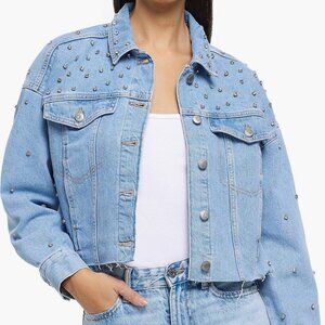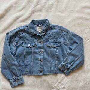 RIVER ISLAND Crystal Embellished Cropped Blue Denim Jacket Size: M