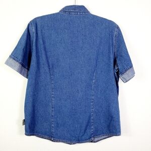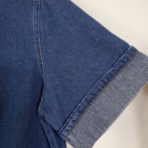 Pearl snaps, cuffed sleeve, collar, denim shirt.