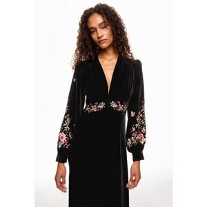 Elevate your evening look with this stunning RIXO Black Velvet Floral Embroidered Gown in size US 2. Crafted from luxurious velvet, this long sleeve dress features intricate floral embroidery, a deep V-neckline, and a flowing maxi length silhouette that exudes elegance. Perfect for weddings, holiday parties, galas, or any formal event.