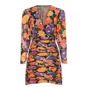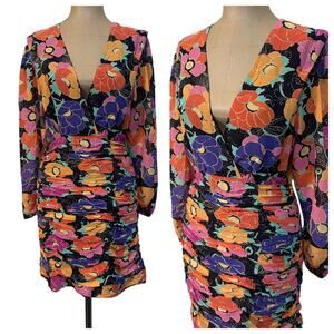 RIXO size 6 Mini Dress Black and Pink Floral Silk V Neck Sheath Ruched Skirt