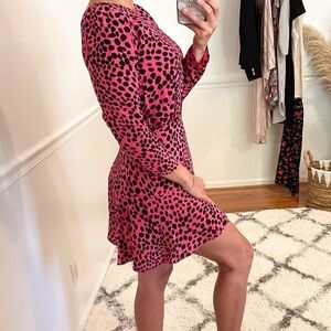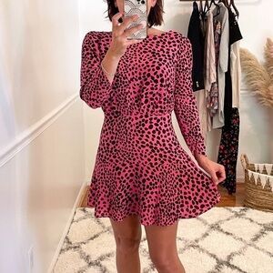NWT RIXO Kyla Leopard Print Barbiecore Mini Dress in Pink. Women's Size Extra Small. New with tags! 100% silk, pink leopard print, 3/4 length sleeve, open scoop back, unlined, lightweight, mini dress, hidden side zip with three fabric-covered buttons. Approximate measurements: 36" chest, 26" waist, 32" length. Excellent pre-owned condition, no visible flaws. New with tags.