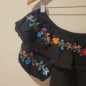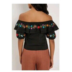 RIXO Lisette Top Floral-Embroidered Cotton Off The Shoulder Shirt Boho Preppy XS