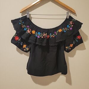 RIXO Lisette Top Floral-Embroidered Cotton Off The Shoulder Shirt Boho Preppy