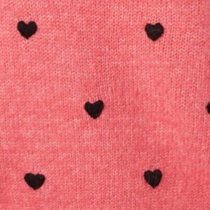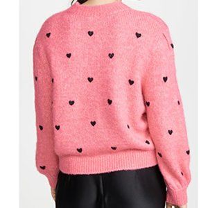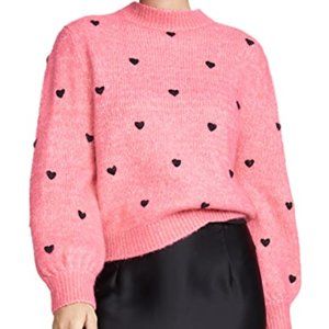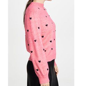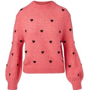 A wool blend knit pullover with contrast-embroidered hearts all-over and ribbed hems.