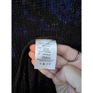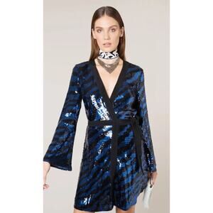 Sequin navy and black wrap mini dress in tiger print. This is a super flattering dress which falls above the knee with a wrap tie at the waist. Great for a cocktail party.