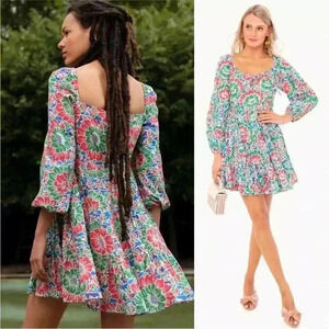 This Rixo London floral dress is adorable! Perfect for that upcoming vacation to a fancy resort. The colors are vibrant and bold. It has a zipper side closure. (See picture), swings skirt and tie at the neck. It also has wide shoulders a very feminine flare.