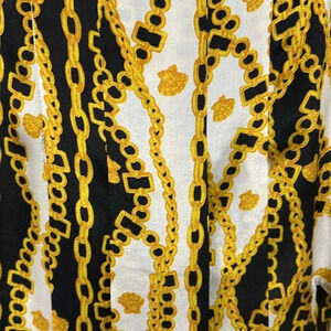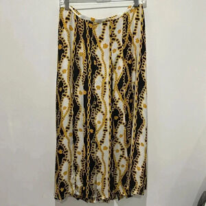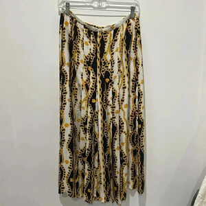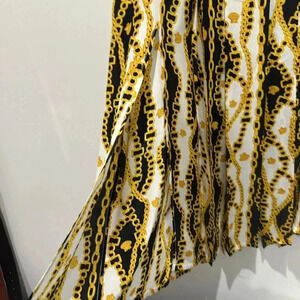 Beautiful RIXO silk skirt. Black and gold print with chains and seashells. Versace inspired. Two front slits on each side. Midi length. Beautiful pleats on front and back of skirt. Size small. Tags attached.