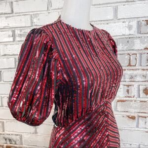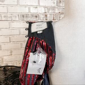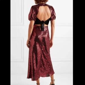 Introducing the beautiful RIXO X Laura Jackson Daisy midi dress, a chic and unmistakable choice for your wardrobe! Featuring an eye-catching combination of red sequins and velvet, this piece is bound to become your favorite.