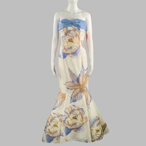 RIZIK BROS. Size 6 Cream Blue Tan Silk Floral Shawl Strapless Gown