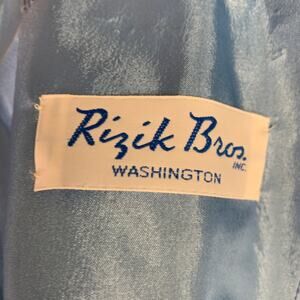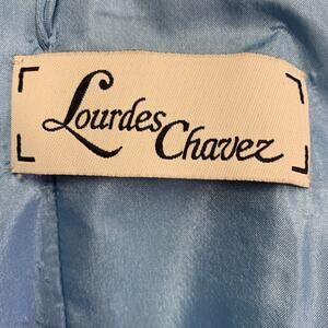 RIZIK BROS. by LOURDES CHAVEZ gown in a cream, blue, and tan silk featuring a floral pattern, matching shawl with blue bow detail, and back zip closure. Made in USA.