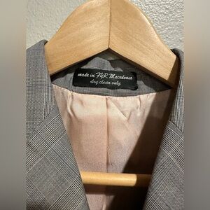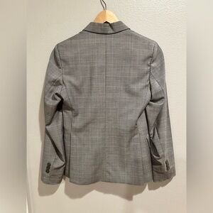 Beautiful light gray RJ Classics Prestige Collection Hunt Jacket. Youth 16R. Gray herringbone with light pink & Blue windowpane undertones. 100% wool. Double vented in back & beautiful in the ring. A few pin holes from numbers in back but otherwise in great shape.