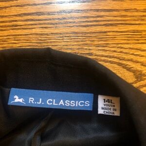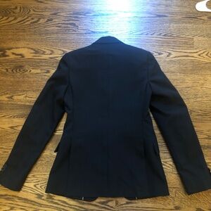 Black herringbone horse back riding show coat. GIRLS 14L. In EXCELLENT condition. Only been worn a few times. 3 buttons in front with fake pockets on either side and shoulder pads. One interior pocket. 100% polyester