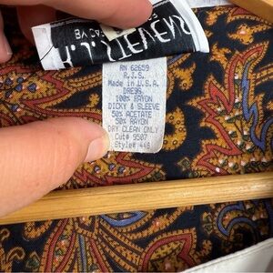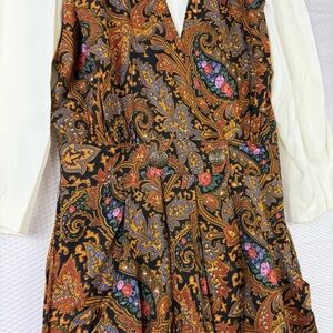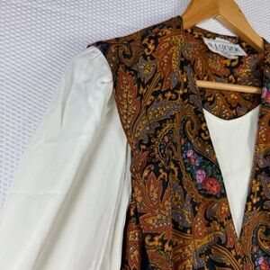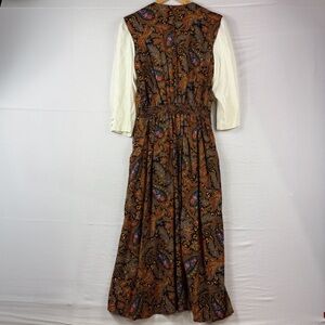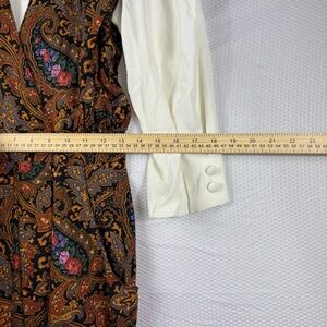 Step back in time with this gorgeous vintage R.J. Stevens maxi dress from the late 70s/early 80s. Features a rich paisley print in warm tones of brown, rust, and gold with hints of pink and teal. Sleeveless style with a deep V-neckline, paired with an attached ivory blouse featuring 3/4 sleeves and button cuffs.