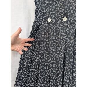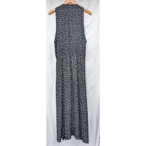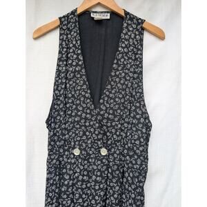 The product is a vintage women's floral deep V maxi jumper from the 90s by RJ Stevens. It features a black floral pattern with a plunging V-neckline, long dress length, and a size 10 fit. The artsy and retro 90s theme adds a unique and stylish touch to this statement piece of clothing. Perfect for those looking for a trendy and comfortable outfit that combines vintage nostalgia with modern style. This would look so cute layered with a basic long sleeve under it during colder temps.
