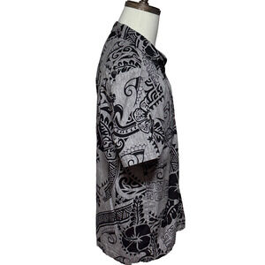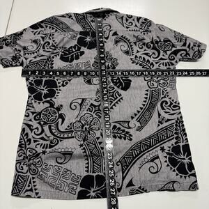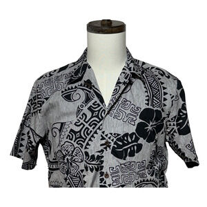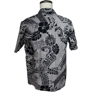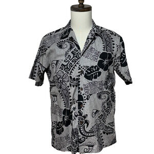 RJC Hawaiian Shirt Mens Medium Black Gray Floral Short Sleeve Wooden Buttons Made in Hawaii Beachy Coastal